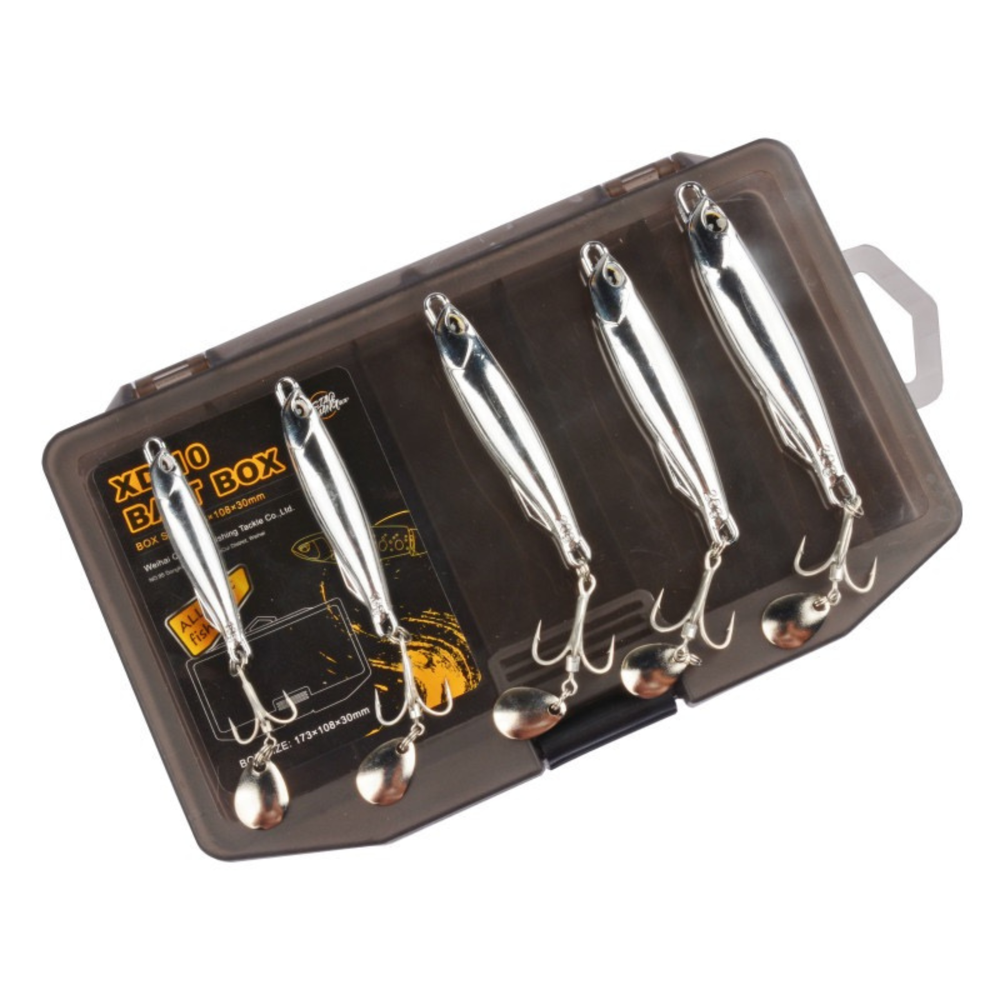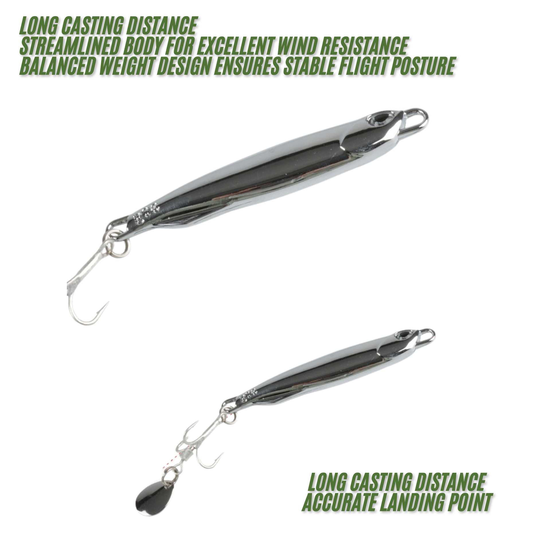 Streamlined aerodynamic body ensures stable flight posture and long casting distance. The spinner blade creates flash and vibration to attract predatory fish from afar.